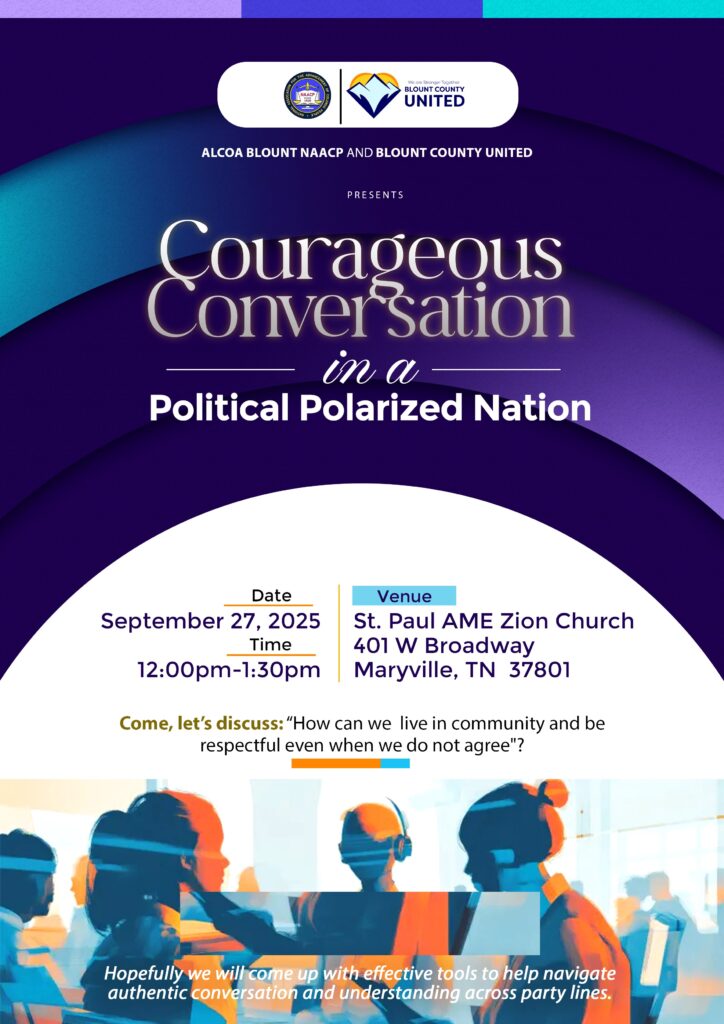 Join the Alcoa Blount NAACP and Blount County United on September 27 @ 12:00 p.m. to engage in honest, heartfelt conversations — not arguments – as we discuss and wrestle with the question “How can we live in community and be respectful even when we do not agree”? With all the political polarization going on in our families, churches, community and world, we need to “talk about it.”