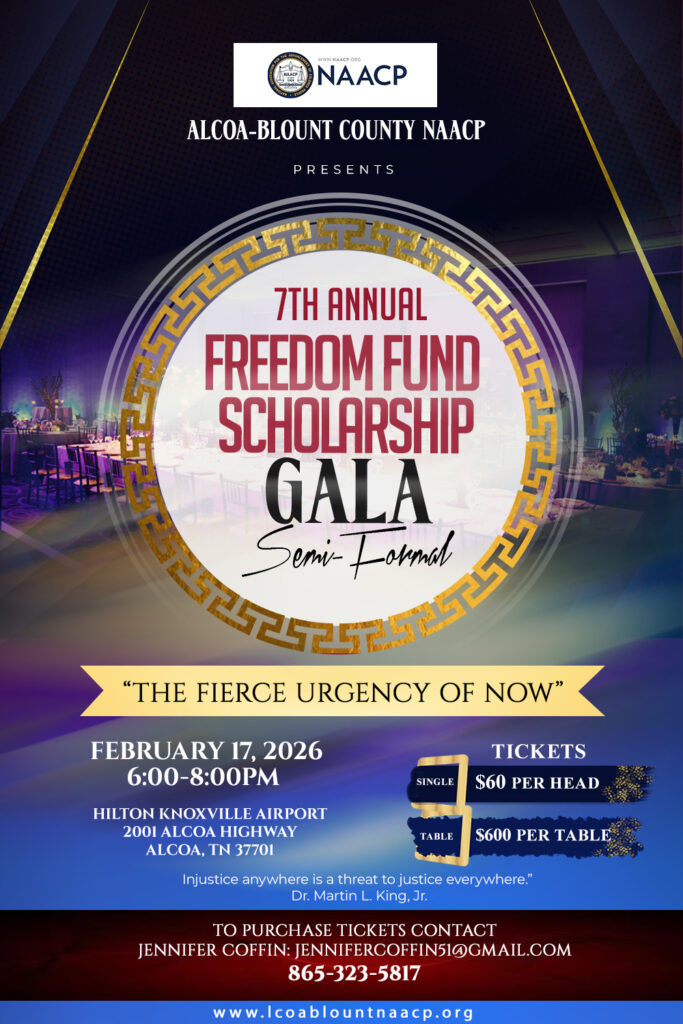 The Alcoa-Blount County NAACP will host its 7th Annual Freedom Fund and Scholarship Gala. This event will honor the founding of the NAACP, pay tribute to an individual or organization who has dedicated their time to the vision and mission of the NAACP and provide scholarships to minority high school seniors.
